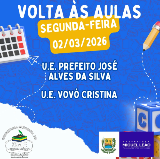A Prefeitura Municipal de Miguel Leão, por meio da Secretaria Municipal de Educação (SME), informa que o início do ano letivo de 2026 na Rede Municipal de Ensino está marcado para a próxima segunda-feira, dia 02 de março.