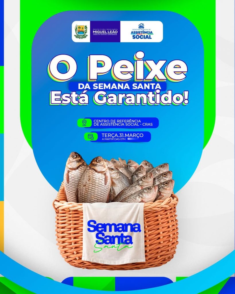 A Prefeitura Municipal de Miguel Leão, por meio da Secretaria Municipal de Assistência Social e da Secretaria Municipal de Educação , informa à população que a tradicional entrega do peixe da Semana Santa já tem data, horário e local definidos.